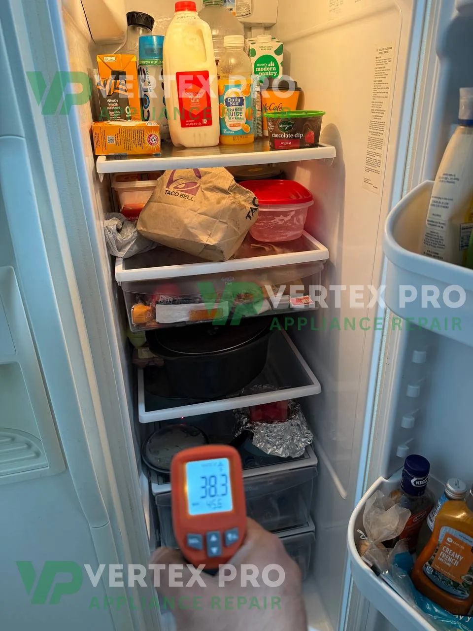 The customer reported that the fresh food section was not cooling properly, with temperatures climbing above 38°F, while the freezer compartment remained within range. A full system inspection was performed, and the root cause was identified as a failed evaporator fan motor combined with a partially blocked air duct. After replacing the fan and clearing the ducts, the system returned to normal operation. Final temperature checks confirmed stable 0–2°F in the freezer and 36–38°F in the refrigerator.